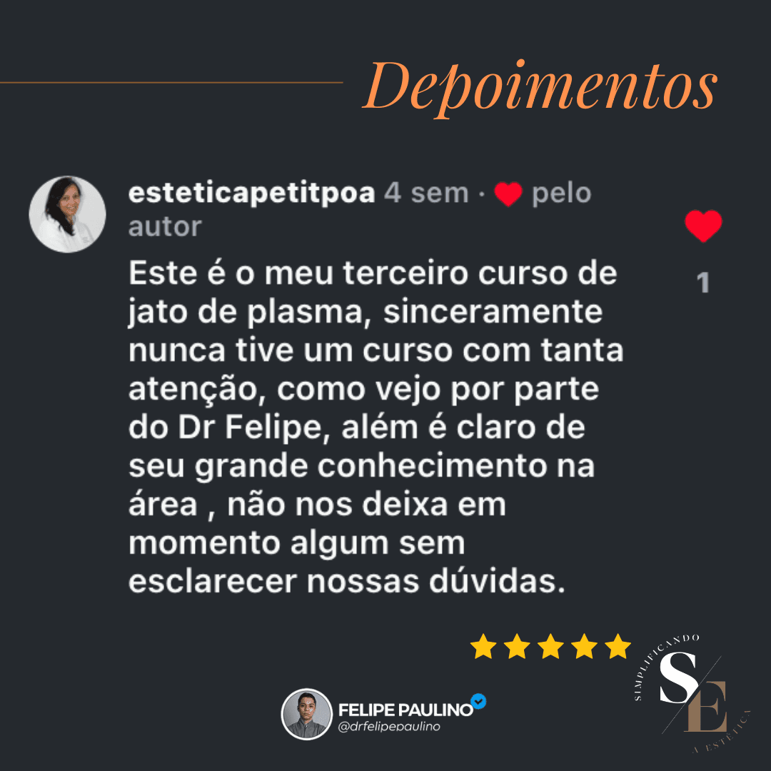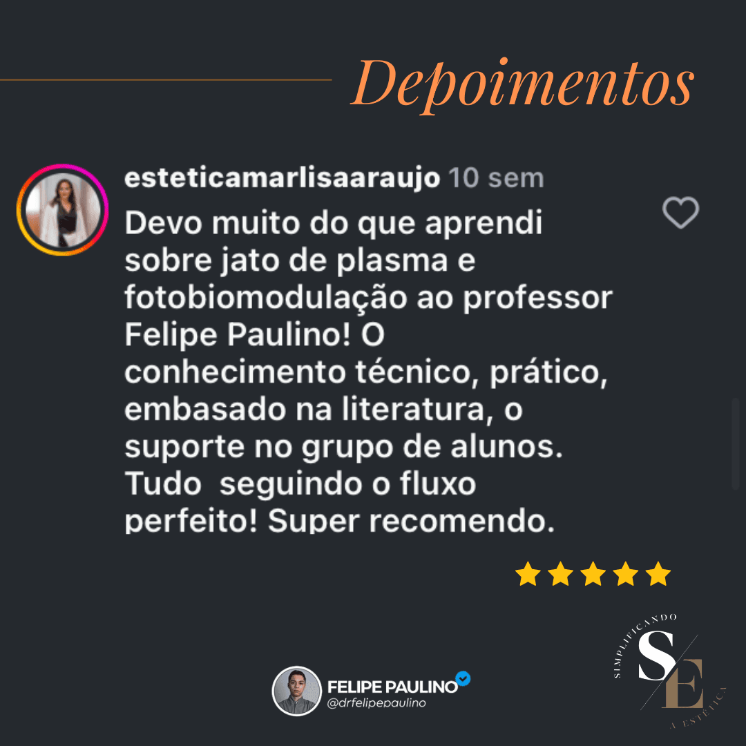 Após concluir os 3 módulos principais, você terá acesso a uma aula bônus especial com o Dr. Felipe Paulino revelando aplicações avançadas do Jato de Plasma que poucos profissionais dominam. Essa aula bônus é um divisor de águas: ela te possibilita conhecer o que poucos profissionais conhecem. Esse conteúdo não está disponível em nenhum outro lugar. É exclusivo para quem acessa essa formação.